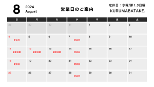 8月の休業日のお知らせ 投稿者 kurumabatake投稿日:2024年7月30日 8月の休業日のお知らせです。 どうぞよろしくお願いいたします。 急な変更がありましたら随時コチラに掲載させていただきます。