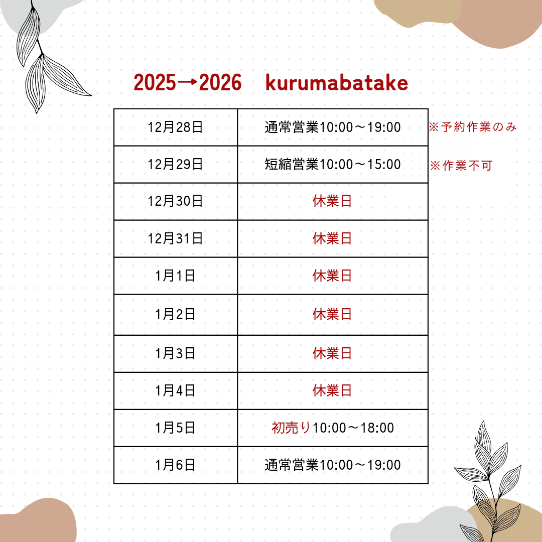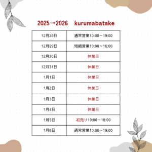 年末年始営業のお知らせ 投稿者 kurumabatake投稿日:2025年12月27日2025年12月27日 2025年、残すところあとわずかとなりました。 あと数日駆け抜けます! よろしくお願いいたします😊